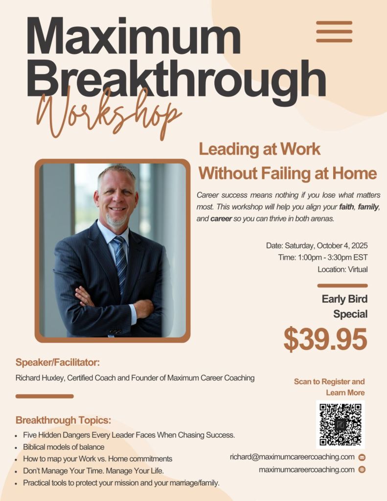 These are the final 2 days to lock in Early Bird Pricing for the Maximum Breakthrough Workshop: Leading at Work Without Failing at Home. The price goes up on October 1st. If you haven’t done so already, reserve your seat today for October 4th’s Maximum Breakthrough Workshop. Click here to register and learn more.