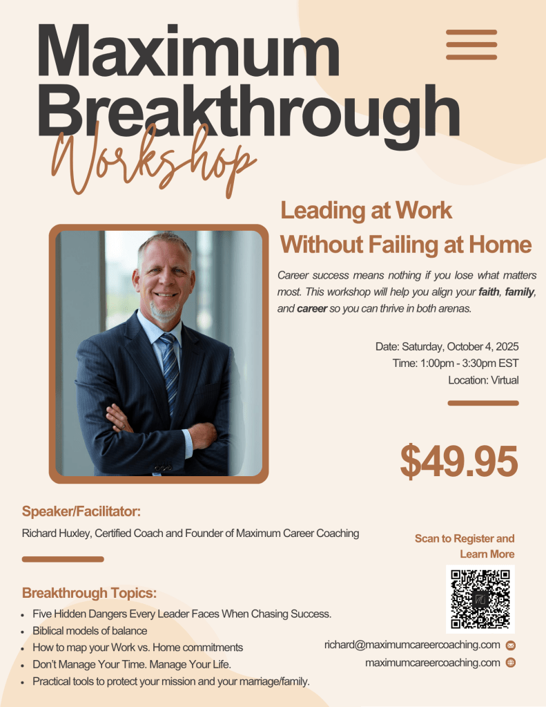Join us for a powerful and inspiring Maximum Breakthrough Workshop that will help you uncover the hidden dangers that sabotage balance, provide clarity on what truly matters, and equip you with practical steps to protect both your mission and your marriage/family.